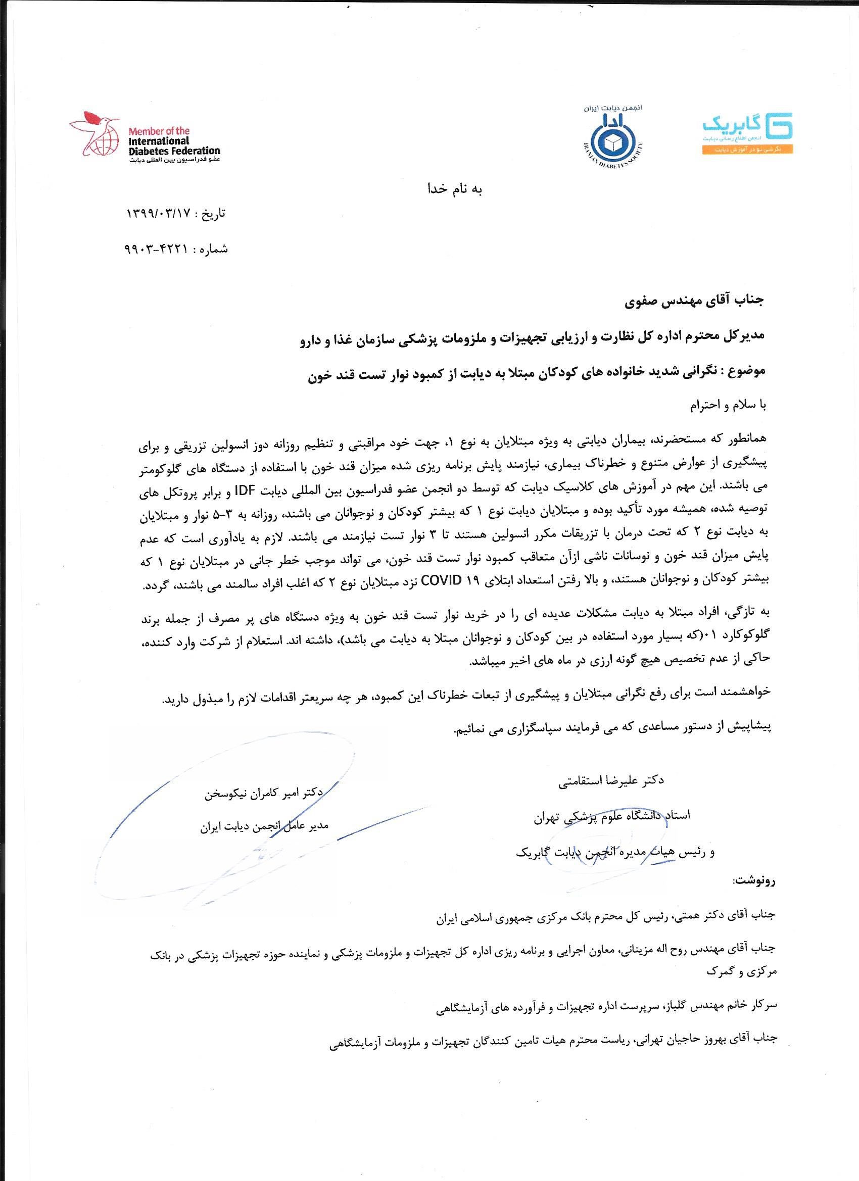 انجمن دیابت گابریک با مشارکت انجمن دیابت ایران، انجمن علمی متخصصین غدد ایران و انجمن علمی غدد و متابولیسم کودکان ایران، نامهای خطاب به آقای مهندس صفوی، مدیر ادارۀ کل نظارت و ارزیابی تجهیزات و ملزومات پزشکی سازمان غذا و دارو ارسال کرد.