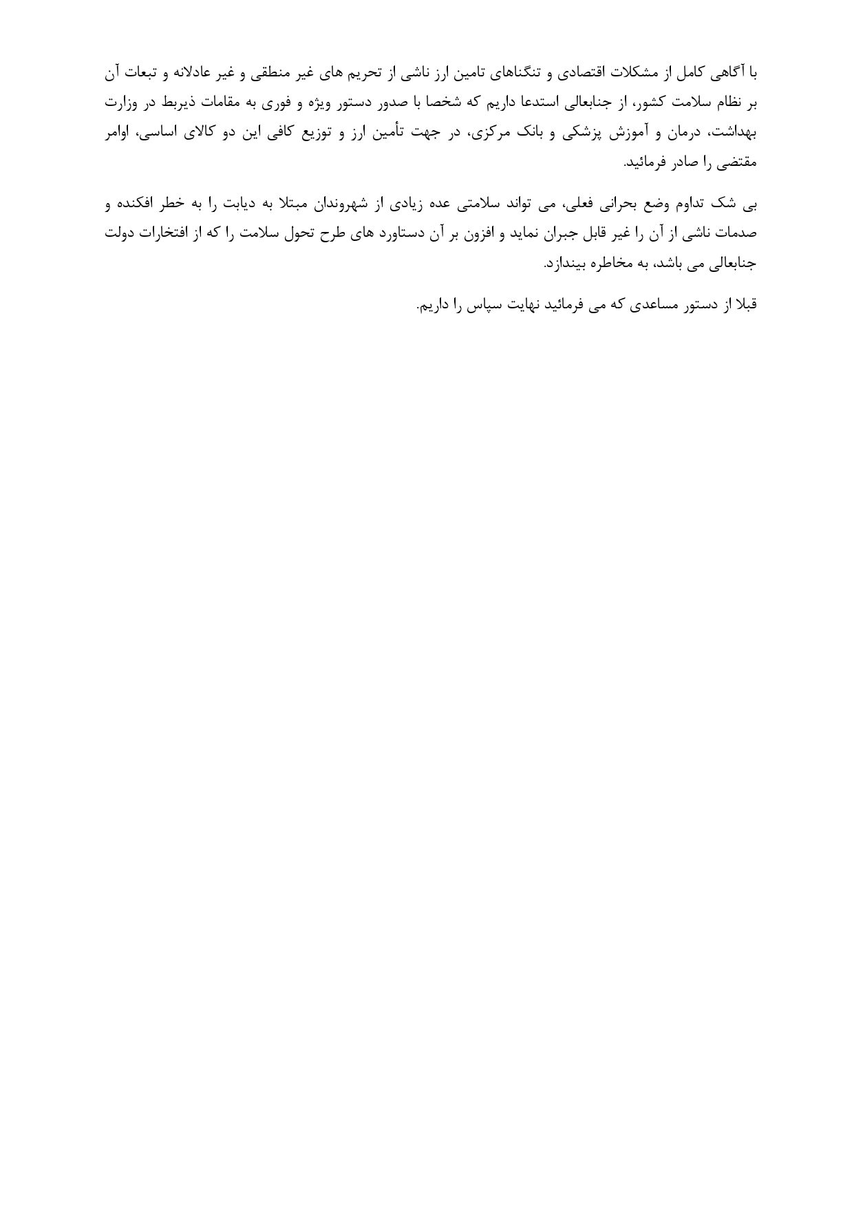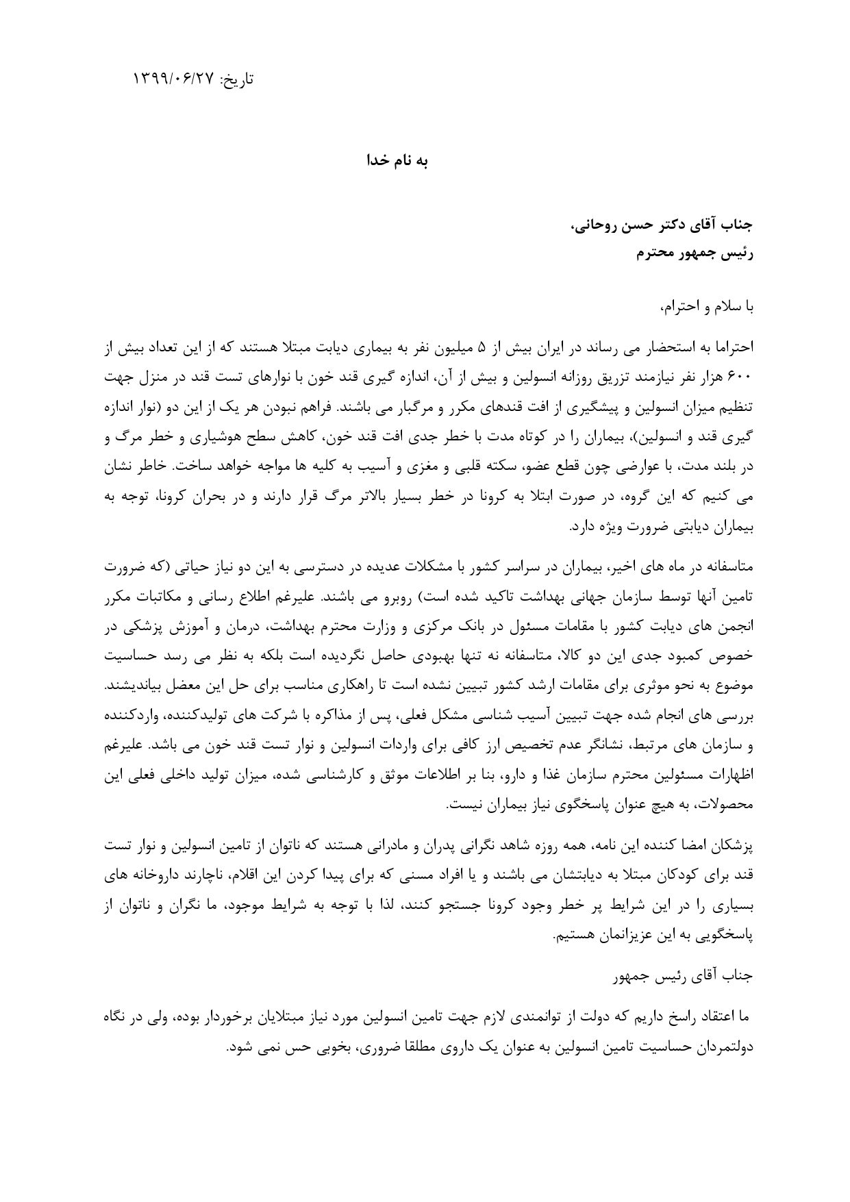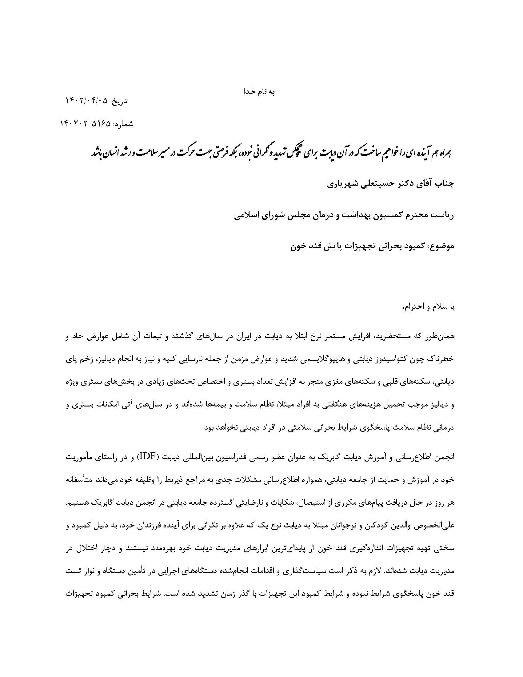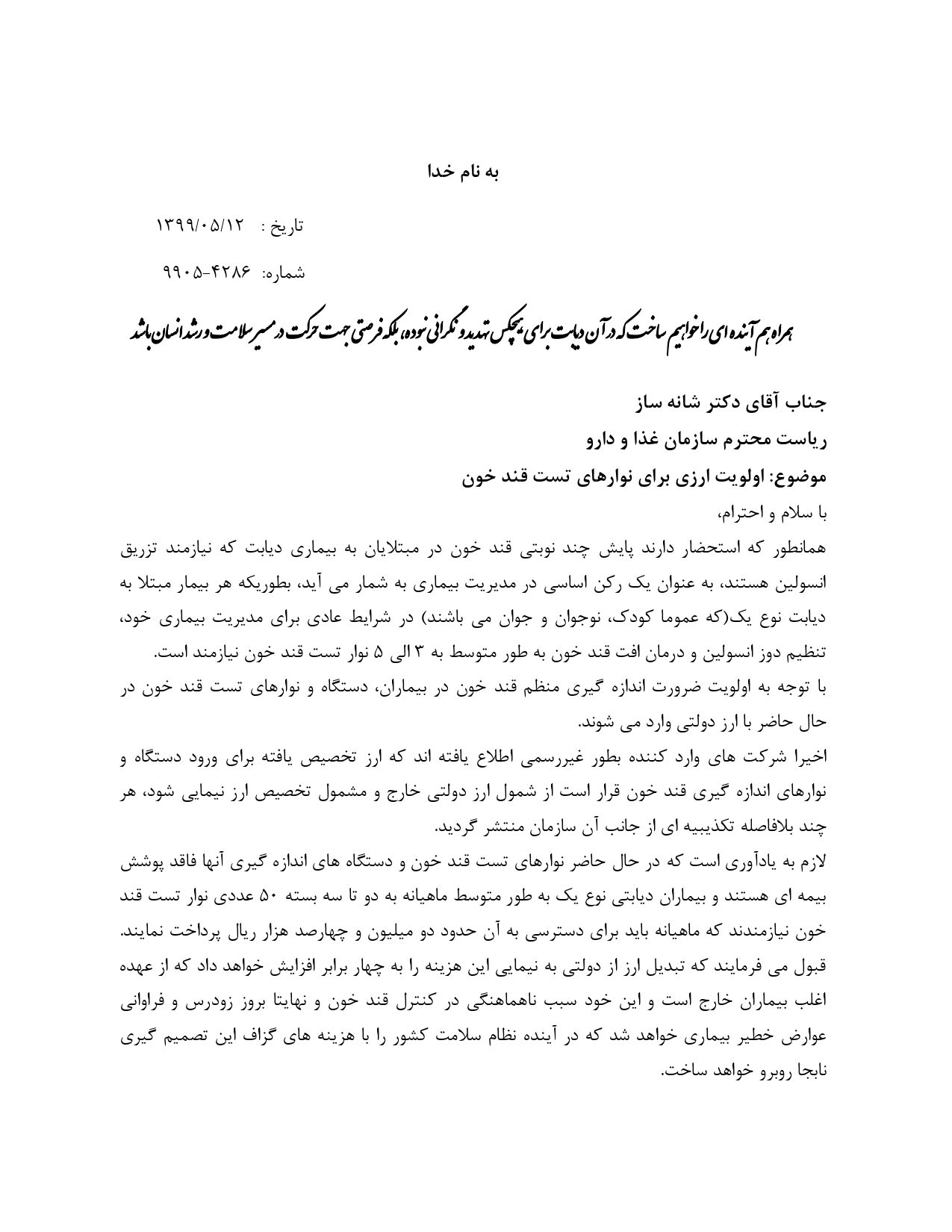- موضوع نامه: اطلاعرسانی کمبود بحرانی نوار تست قند خون در کشور و درخواست رسیدگی فوری و اتخاذ تصمیمات مقتضی برای بهبود شرایط بیماران و کاهش رنج زندگی با بیماری مزمن دیابت