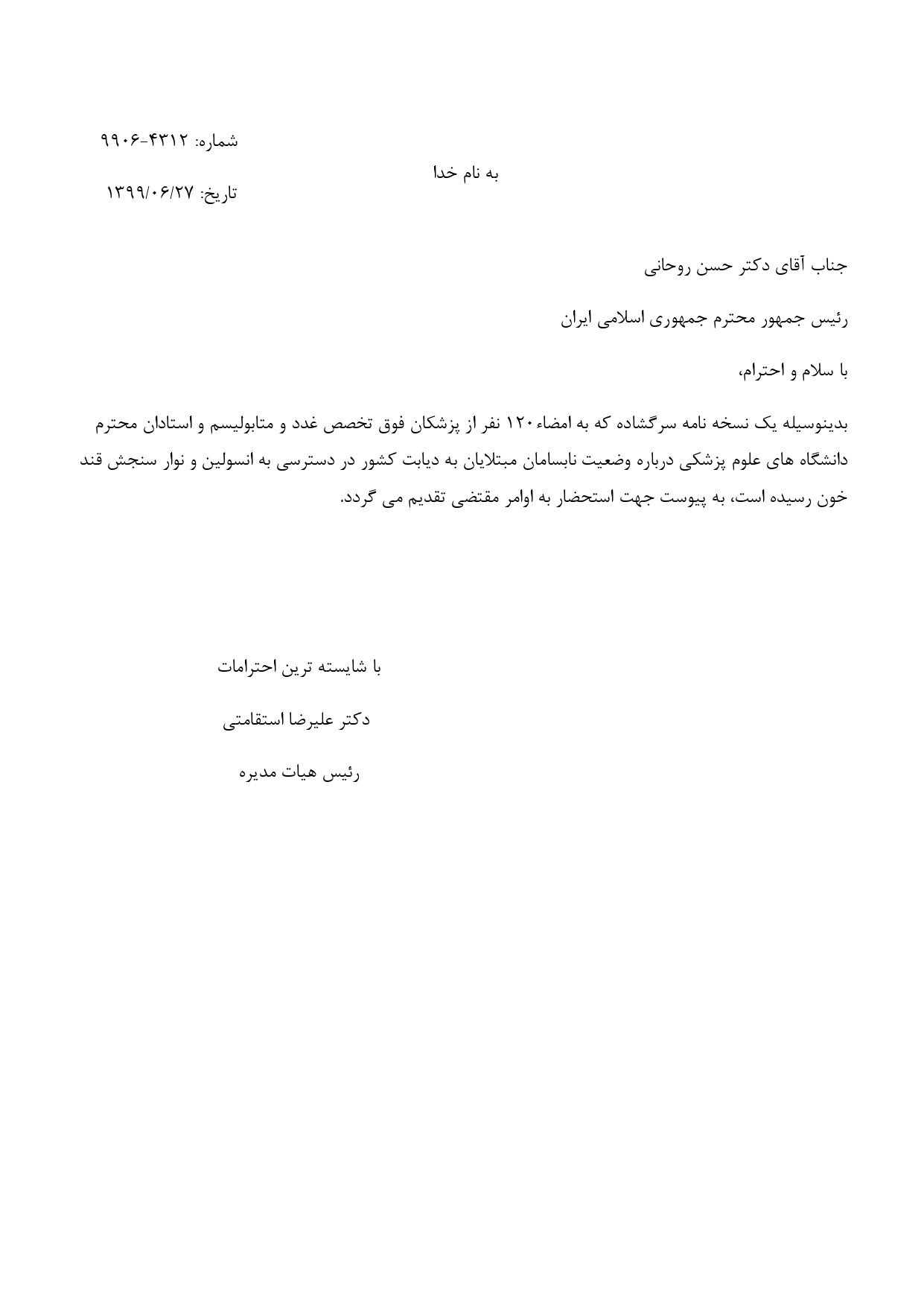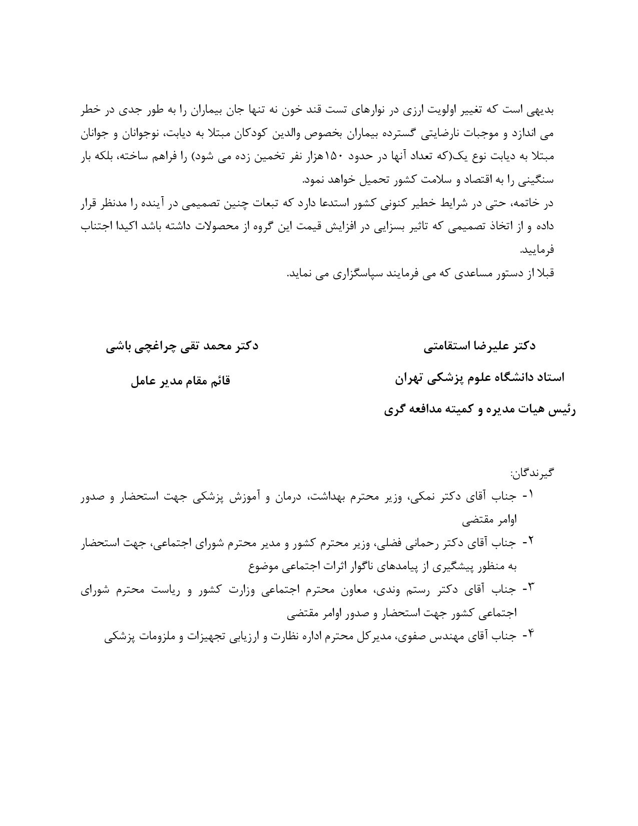 - رونوشت این نامه به سایر مقامات مسئول ازجمله وزیر بهداشت، درمان و آموزش پزشکی، معاون بهداشت، معاون غذا و دارو، مدیرعامل سازمان بیمهگر و … ارسال شد.
