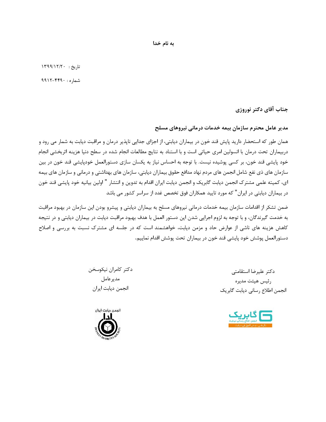 انجمن دیابت گابریک با مشارکت انجمن دیابت ایران نامهای خطاب به آقای دکتر نوروزی، مدیرعامل سازمان بیمۀ نیروهای مسلح استان تهران، ارسال کرد.