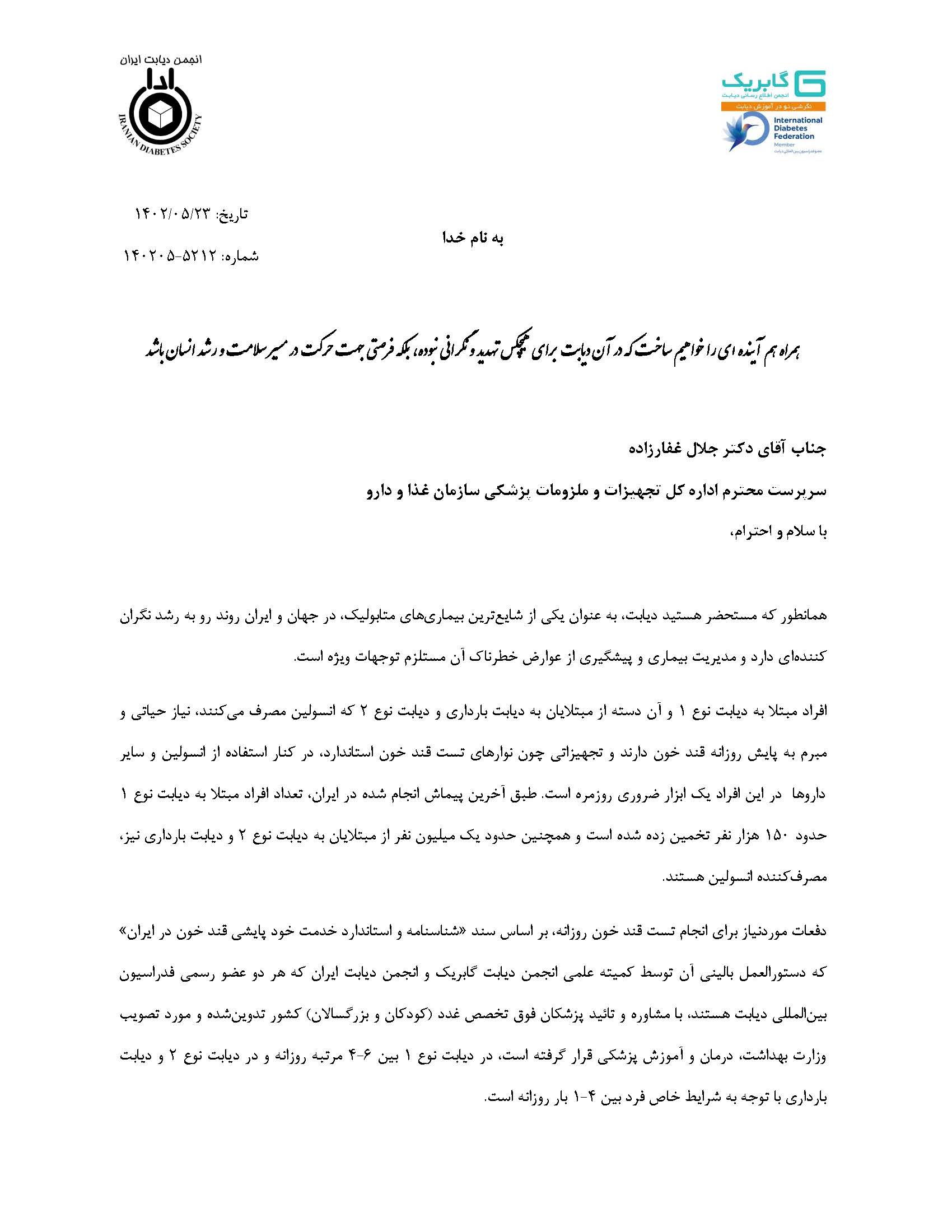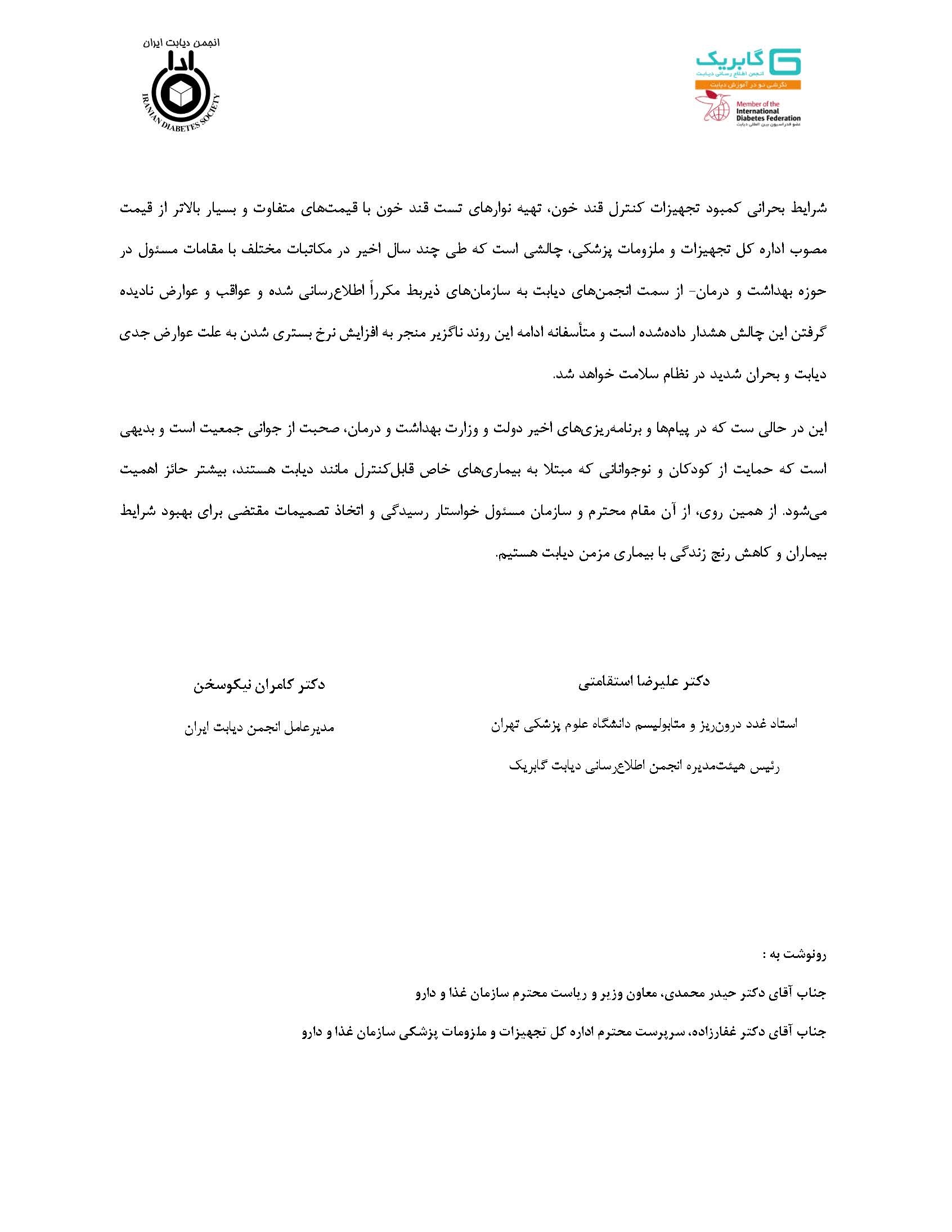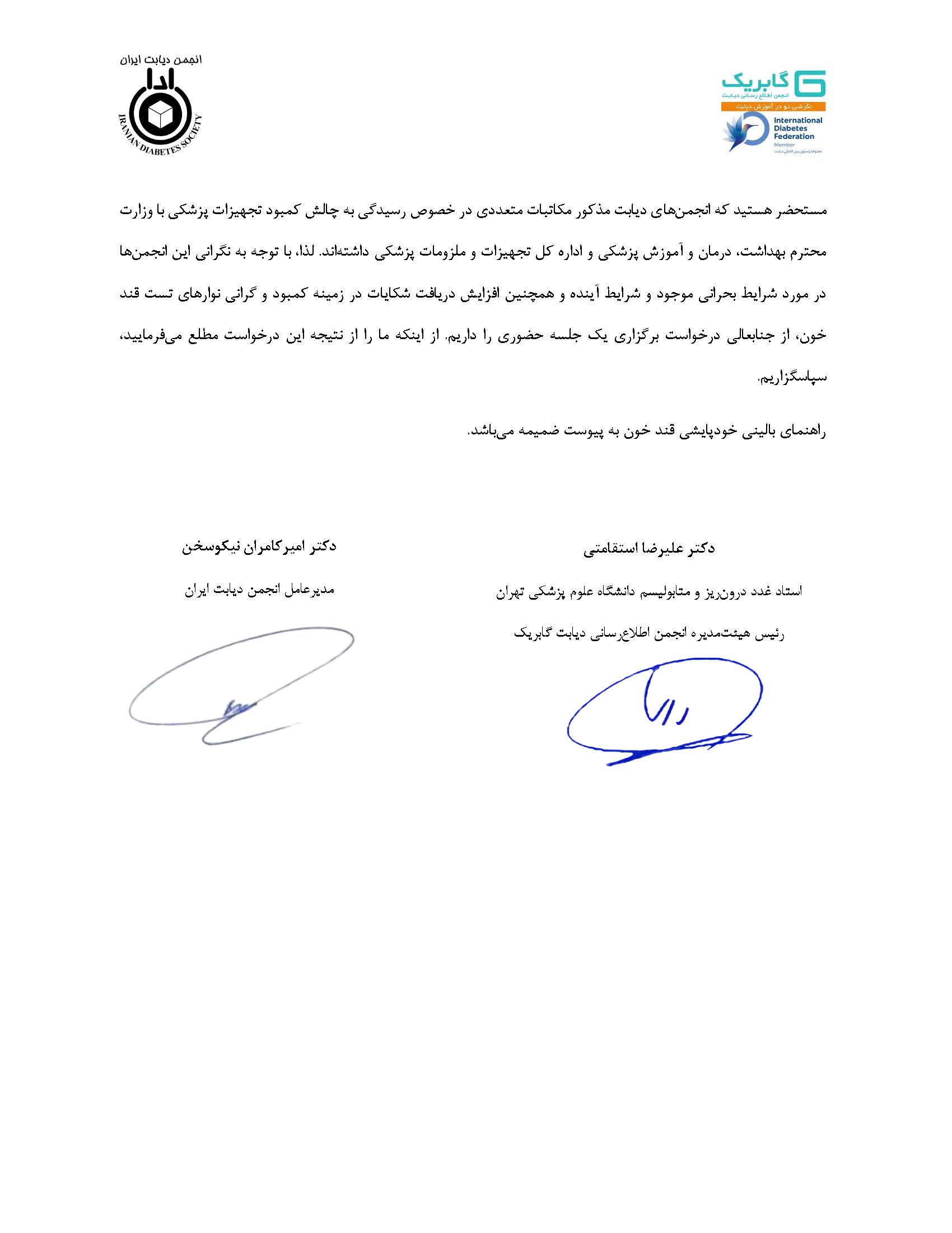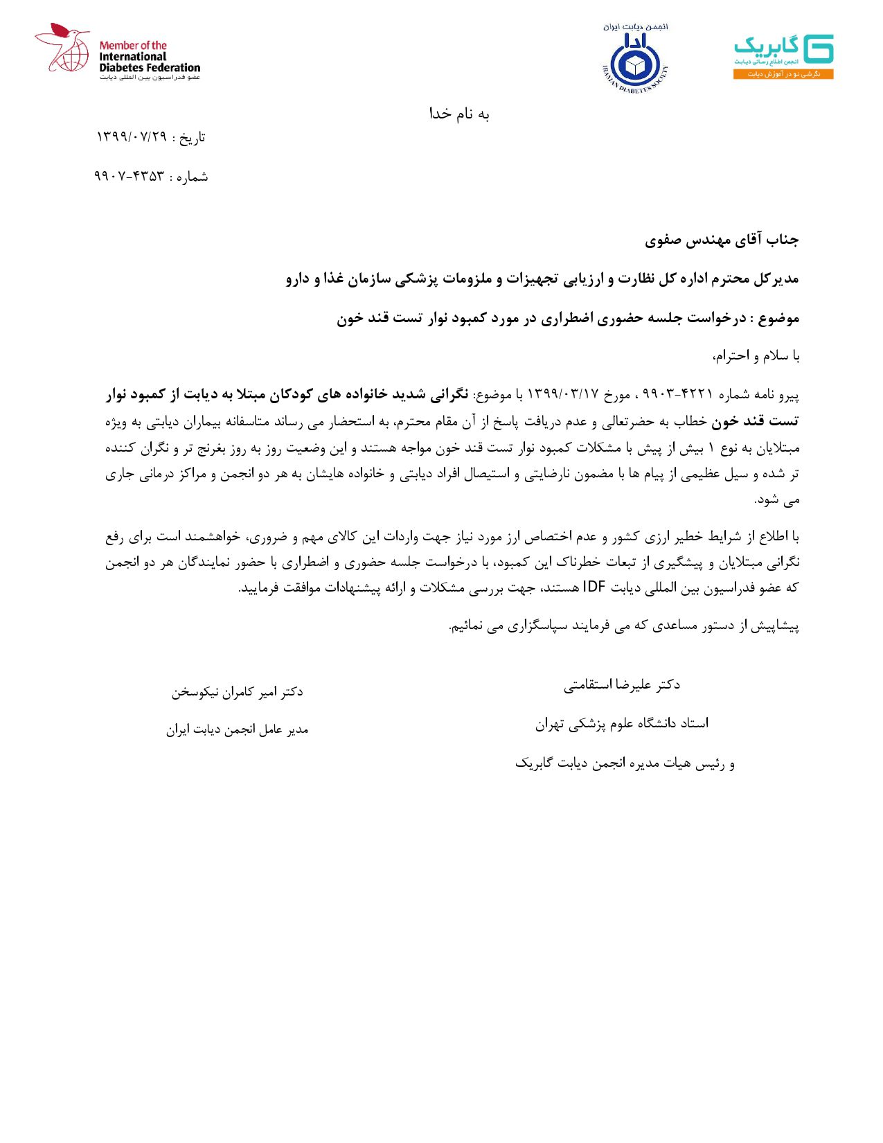 - موضوع نامه: درخواست جلسۀ حضوری اضطراری دربارۀ کمبود نوار تست قند خون با حضور انجمن دیابت گابریک و انجمن دیابت ایران که هر دو عضو فدراسیون بینالمللی دیابت IDF هستند، برای بررسی مشکلات و ارائۀ پیشنهادها