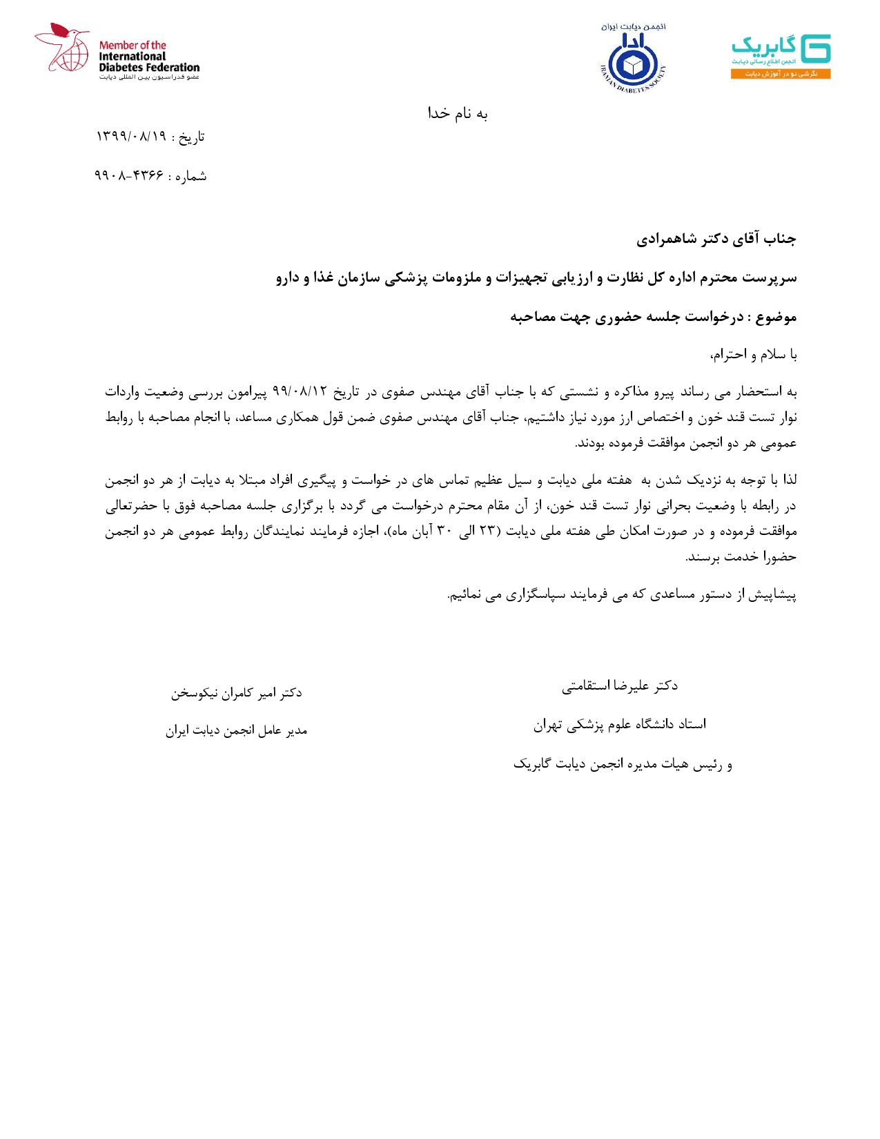 - موضوع نامه: درخواست برگزاری جلسۀ مصاحبۀ حضوری در هفتۀ ملی دیابت (۲۳ الی ۳۰ آبان ماه)، دربارۀ رسیدگی به مشکل کمبود نوار تست قند خون، با حضور نمایندگان روابط عمومی انجمن دیابت گابریک و انجمن دیابت ایران