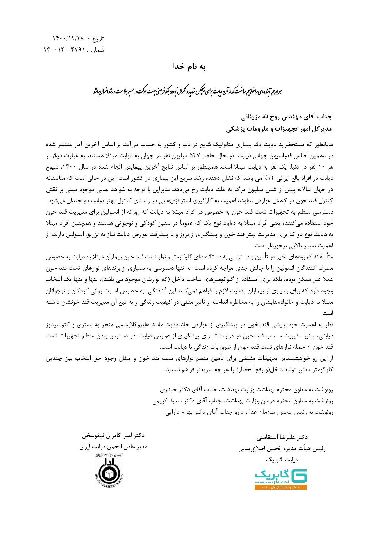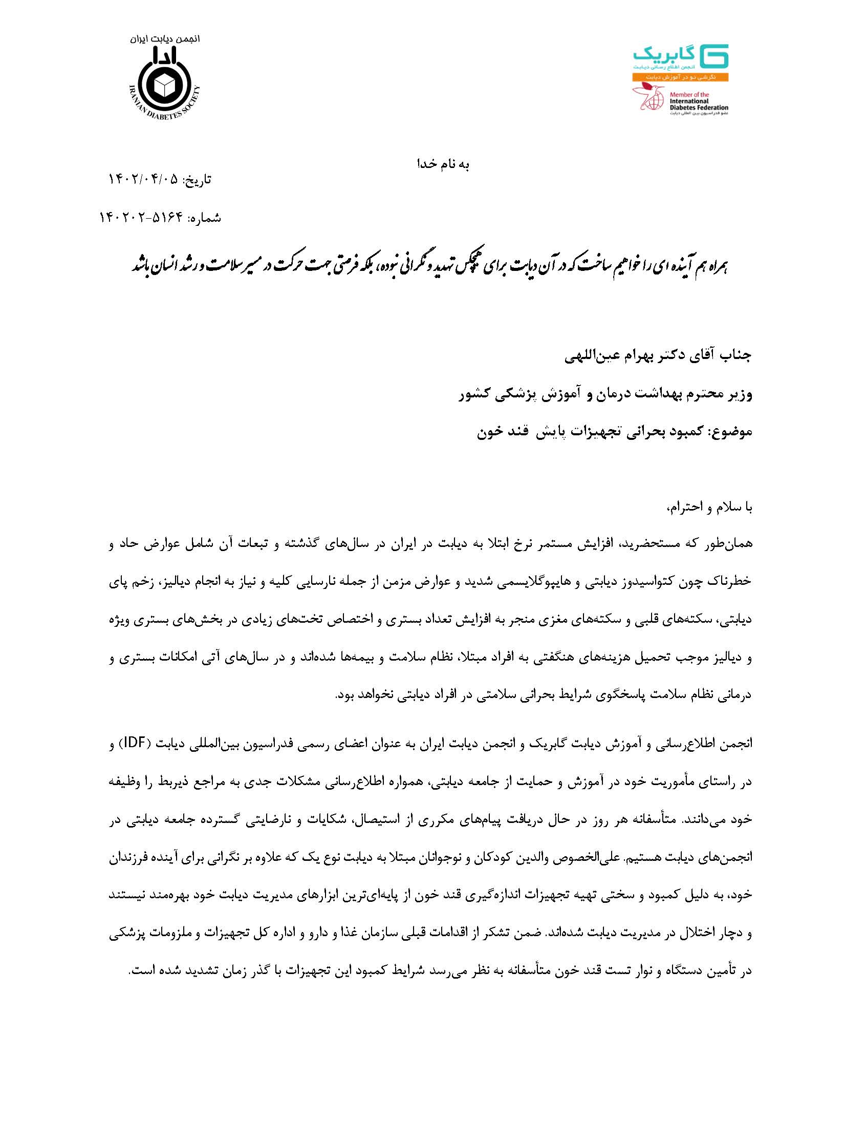 انجمن دیابت گابریک با مشارکت انجمن دیابت ایران نامهای به آقای دکتر بهرام عیناللهی، وزیر بهداشت، درمان و آموزش پزشکی کشور ارسال کرد.