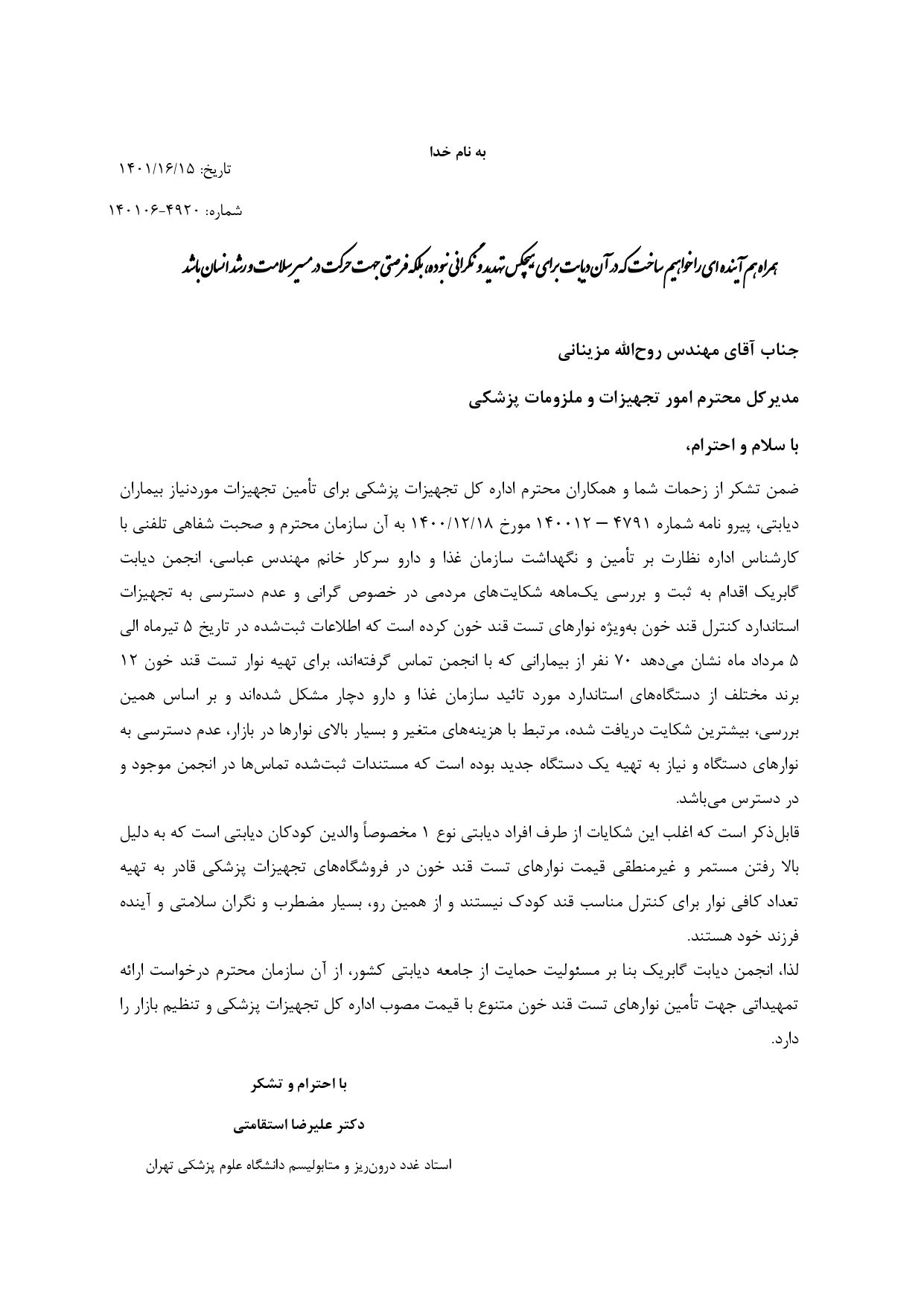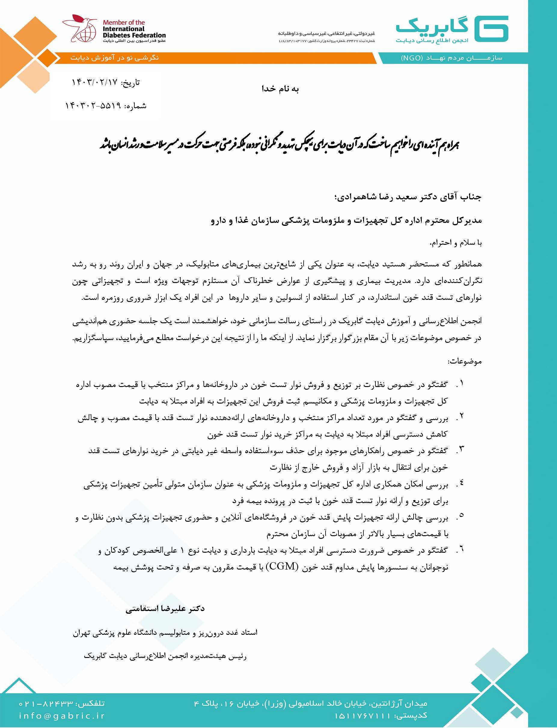 نامۀ مجدد ازطرف انجمن دیابت گابریک با مشارکت انجمن دیابت ایران، خطاب به آقای مهندس صفوی، مدیر کل نظارت و ارزیابی تجهیزات و ملزومات پزشکی سازمان غذا و دارو ارسال شد.