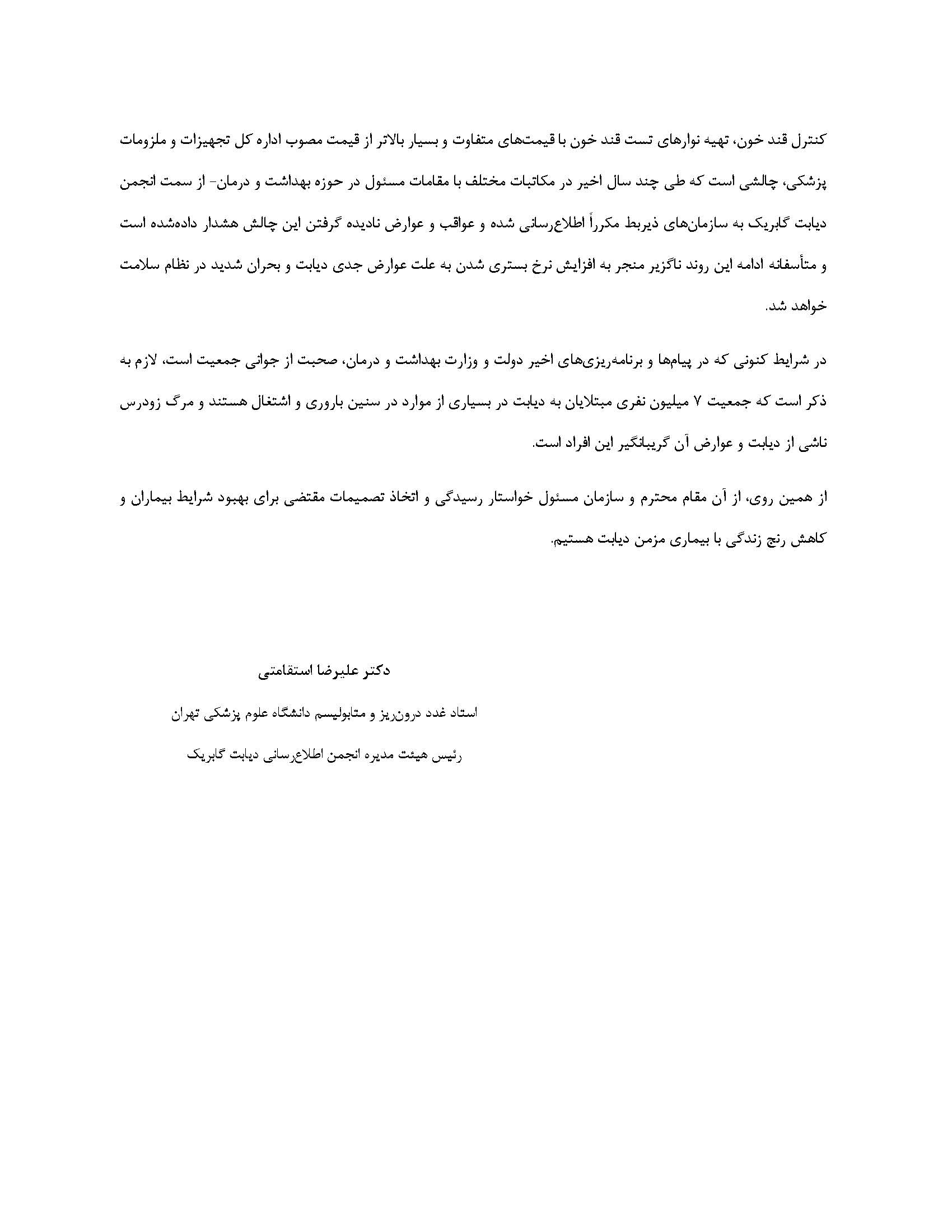 - موضوع نامه: درخواست جلسۀ حضوری برای گفتگو و تعامل در مورد تامین نوار تستهای مورد نیاز هر فرد مبتلا به دیابت طبق دستورالعمل کشوری خودپایشی قند خون (که انجمن دیابت گابریک با همکاری و مشارکت انجمنهای دیابت و غدد کشور و تائید فوق تخصصان غدد و متابولیسم تدوین کرده و با تائید وزارت بهداشت و درمان به کلیه مراکز ذیربط ابلاغ کردهاست) و همفکری درخصوص شرایط بحرانی موجود.