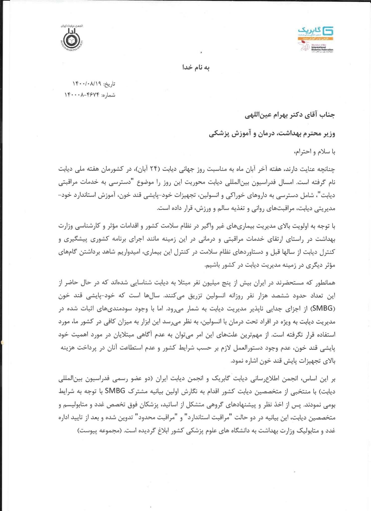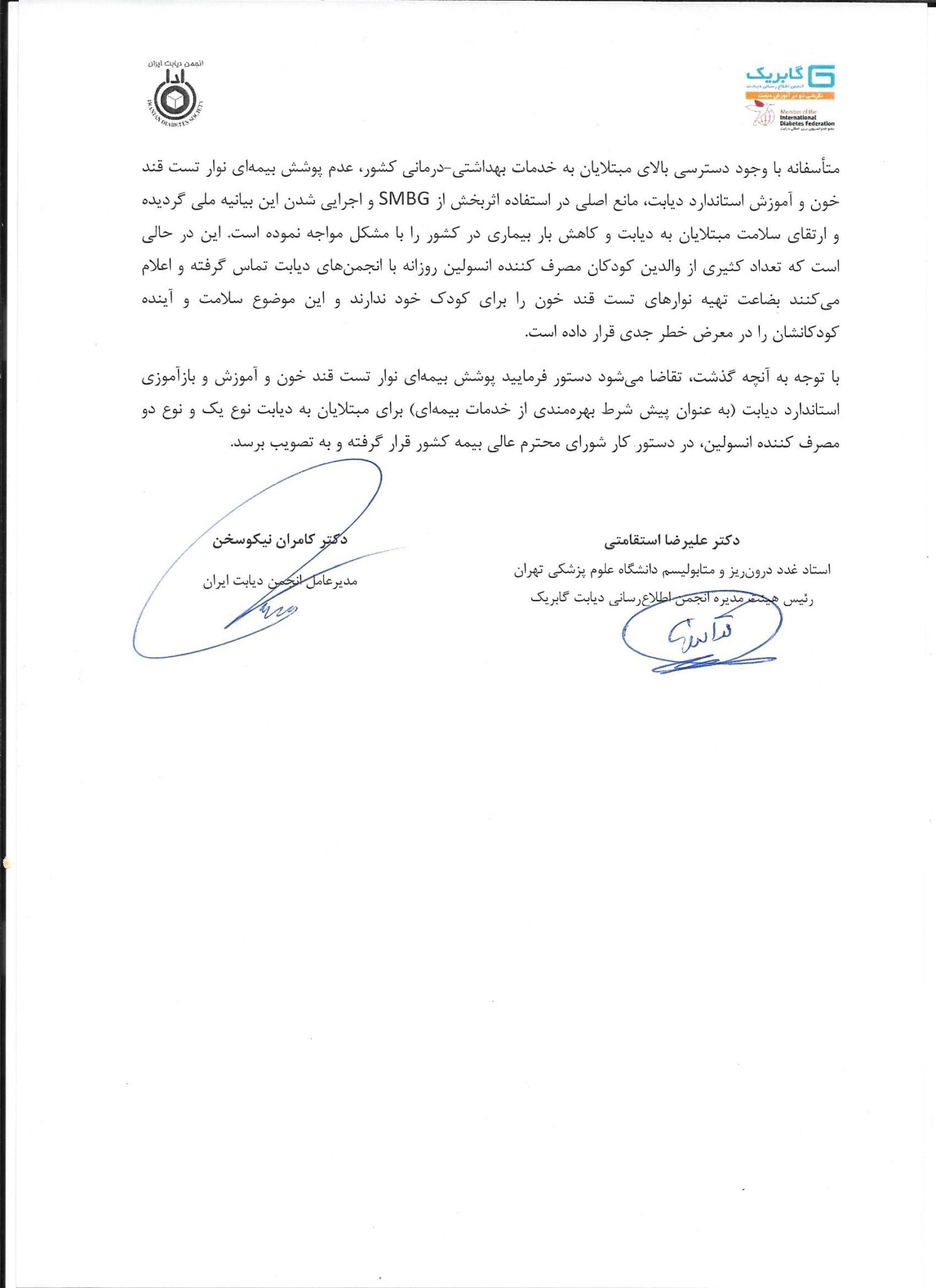 با توجه به آنچه گذشت، تقاضا میشود دستور فرمایید پوشش بیمهای نوار تست قند خون و آموزش و بازآموزی استاندارد دیابت (به عنوان پیش شرط بهرهمندی از خدمات بیمهای) برای مبتلایان به دیابت نوع یک و نوع دو مصرف کننده انسولین، در دستور کار شورای محترم عالی بیمه کشور قرار گرفته و به تصویب برسد.